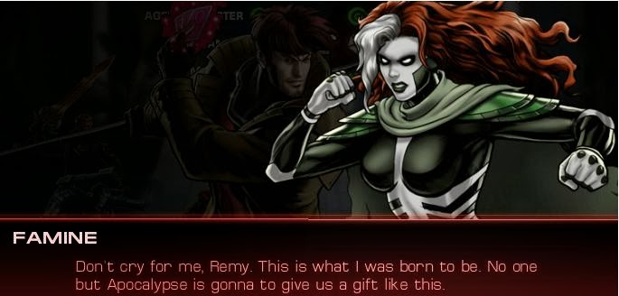 Ngalahin Apocalypse itu susah bro, mesti ngelewatin skor 100.000. Untuk dapet skor itu, berarti mesti lawan Apoc komplit dengan 4 Horsemen. Susaaah banget karena para Horsemen itu punya ability yg nyusahin. Emang sih biasanya gw berhasil menang, tapi ada aja anggota tim yg mati, jadinya skornya ga nyampe 100k. Tapi akhirnya gw berhasil dengan tim Wolverine + Deadpool. Wolverine karena dia sering counter attack, dan Deadpool punya kombinasi L2, L6, L9 yg mematikan.